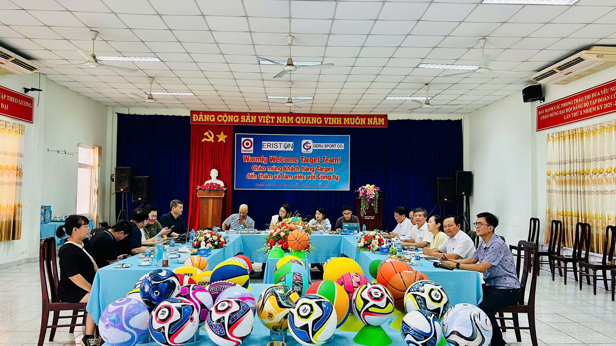 Vào ngày 10/09/2025 vừa qua, Công ty Cổ phần Thể thao Ngôi Sao Geru (Geru Sport Co.) đã vinh dự chào đón đoàn công tác từ Tập đoàn bán lẻ hàng đầu Hoa Kỳ, Target. Đây là chuyến thăm đầu tiên của đại diện Target tới nhà máy sản xuất bóng thể thao của Geru Sport sau nhiều lần trao đổi và làm việc online trước đó, chuyến viếng thăm nhằm tìm hiểu và đánh giá trực tiếp quy trình sản xuất các sản phẩm đáp ứng tiêu chuẩn nghiêm ngặt của thị trường Mỹ.